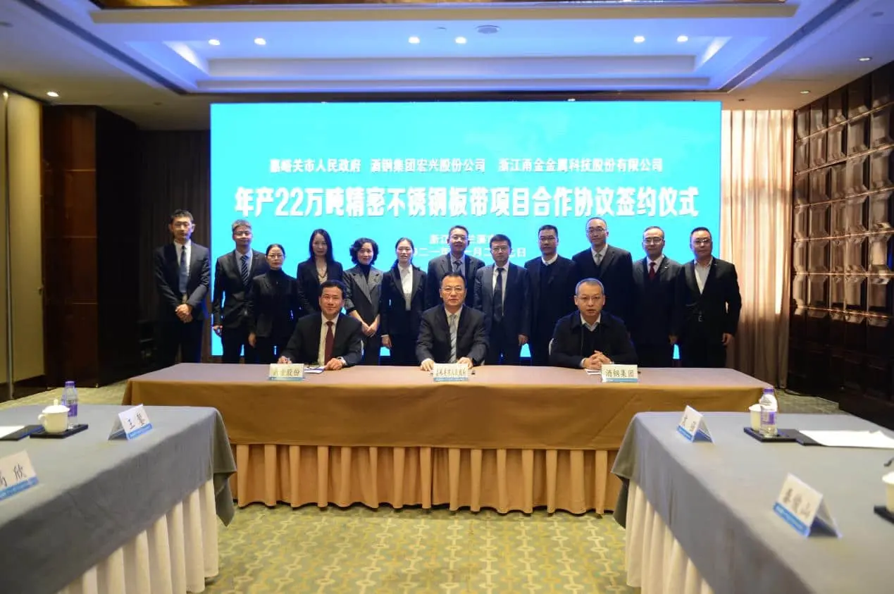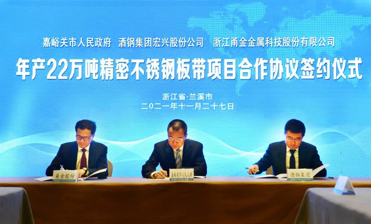 11月27日上午,甬金股份年产22万吨精密九游·官方网站板带甘肃甬金项目在浙江兰溪隆重举行签约仪式。现场出席仪式的嘉宾主要有嘉峪关市委常委、常务副市长赵宝毅先生,酒钢集团党委常委、副总经理成东全先生,酒钢集团宏兴钢铁股份公司党委书记、董事长张正展先生,甬金股份董事长虞纪群先生、总经理周德勇先生等。此次签约仪式的举行,标志着甬金股份在我国西部的首个九游·官方网站项目正式启动。