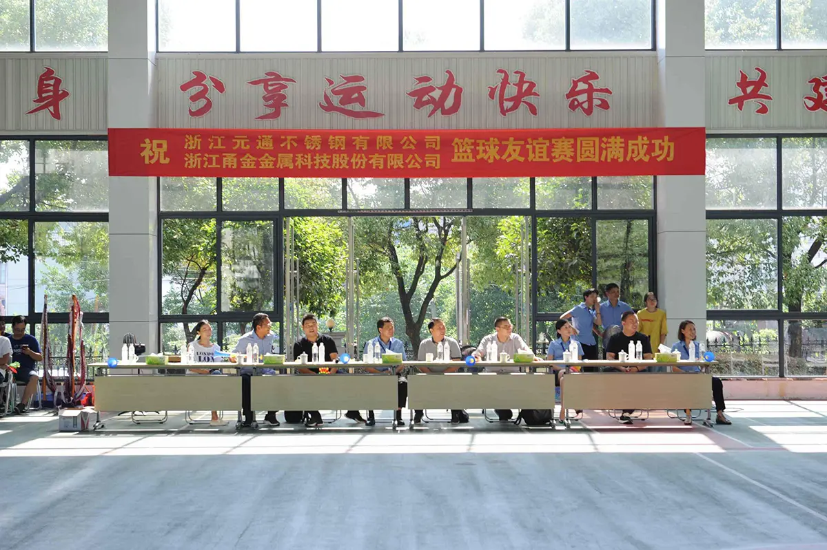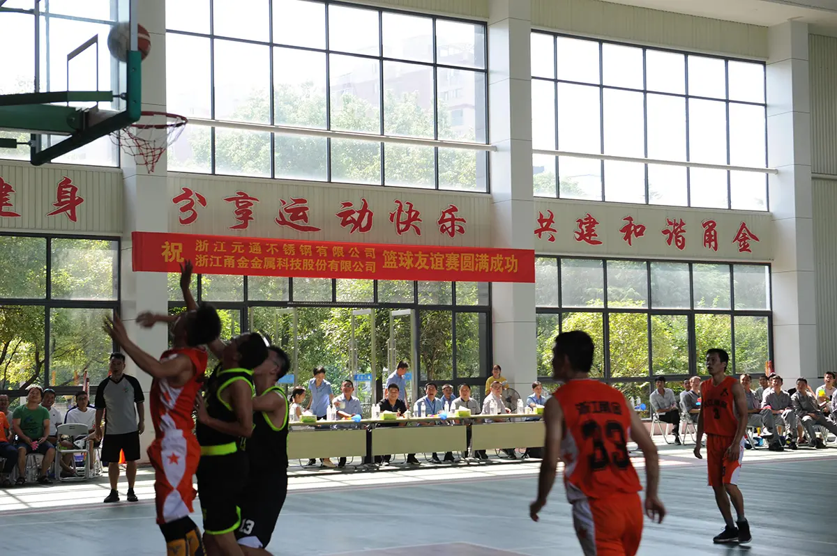 9月20日上午,浙江甬金篮球队与浙江元通不锈钢有限公司篮球队,在我公司体育馆举行了一场篮球友谊赛。浙江甬金金属科技股份有限公司董事长虞纪群和浙江元通不锈钢有限公司董事长郑光良以及双方公司领导到现场观看比赛。
