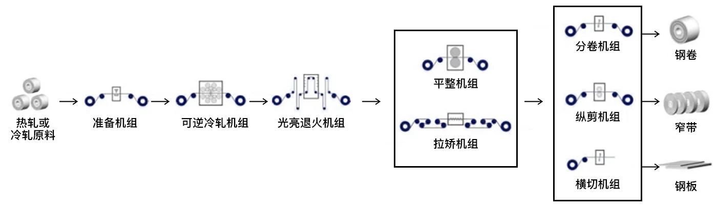 此工艺流程将热轧或九游·官方网站原材料在常温条件下经高精度、可逆式多辊冷轧机组轧制目标厚度,并经光亮热处理达到客户要求的表面效果和机械性能,再经平整或拉矫工序对不锈钢板带的表面及板形进行优化处理,并改善产品的力学性能达到精密九游·官方网站板带所需机械性能,此工艺流程生产的精密九游·官方网站板带在机械性能方面属于软态。